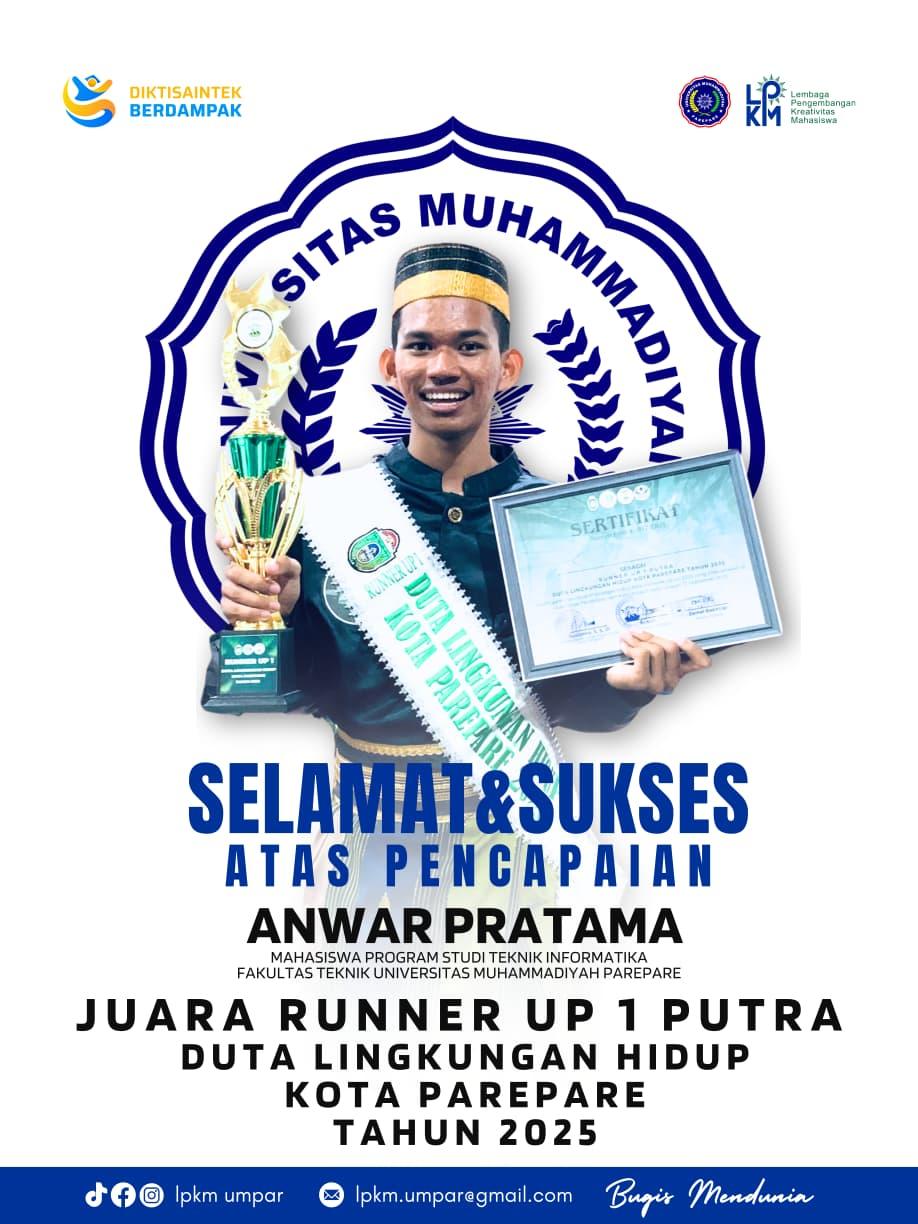Parepare — Prestasi membanggakan kembali diraih oleh mahasiswa Universitas Muhammadiyah Parepare (UM Parepare). Seorang mahasiswa Program Studi Teknik Informatika berhasil meraih gelar Runner Up 1 Putra Duta Lingkungan Hidup Kota Parepare Tahun 2025 pada ajang pemilihan Duta Lingkungan Hidup yang diselenggarakan oleh Dinas Lingkungan Hidup Kota Parepare.